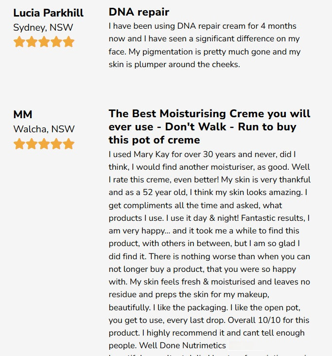 The Nutrimetics Ultra Care+ Platinum DNA Cellular Age Repair Crème is a breakthrough in anti-ageing skincare. Powered by Juveleven Immortal Peptide, it stimulates cellular renewal while supporting your skin’s natural production of Hyaluronic Acid to firm, plump, and smooth your complexion. Protects DNA and cells from UV rays and environmental pollutants, helping reduce visible signs of ageing in as little as 24 hours.*